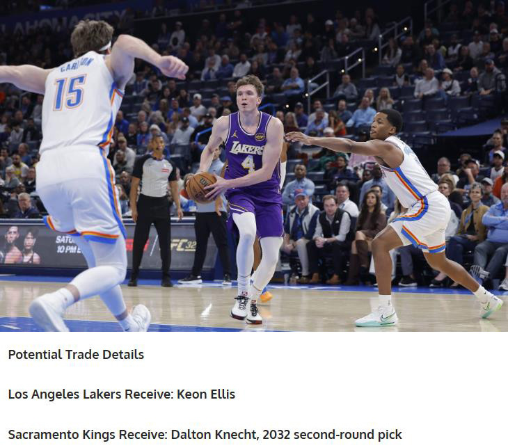 Based on the inefficient performance, to be precise, the Lakers' net loss of 8.7 points per 100 possessions when he was on the court, the US media "Fadea Way" suggested that the Lakers and Kings make a 2-for-1 trade. Specifically, the Lakers sent Knecter and acquired Ellis in the second round of 2032.