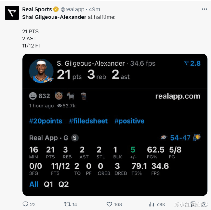 In this game, SGA started with a strong start✊️ in the first quarter, 2 of 3 + free throws, 6 of 7, 10 points, 1 rebound and 1 steal. In 16 minutes of halftime, 5 of 8 + free throws, 11 of 12, 21 points, 3 rebounds, 2 assists, 2 steals and 1 block, yes, 12 free throws in the first half!
