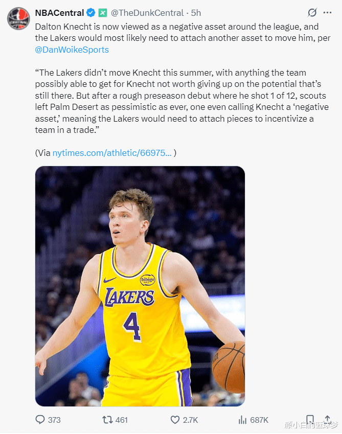 However, there is a difficulty in this, that is, Knect is no longer a high-quality asset. According to a report by Lakers reporter Dan Walker, the outside world already believes that Knect is a negative asset. If you want to trade him, you need to add more assets. The Lakers did not trade him this summer because many teams regarded him as a negative asset. Coupled with his poor performance in the summer league and preseason, his trade value is still declining.