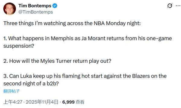 On November 4, the new NBA regular season continues. According to reports from Shams and others, many teams are paying attention to Morant's situation with the Grizzlies, but his trade prospects are not ideal. Tim Bontemps even bluntly said that Morant is not as good as Garland.