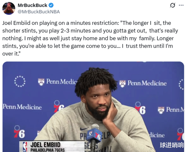 Especially for the arrogant Embiid, after his rebound performance in the previous game, he quickly publicly stated after the game that if there was a time limit and he had to take a break every 2 or 3 minutes, it would be meaningless to him, and he might as well go home early to spend time with his family.