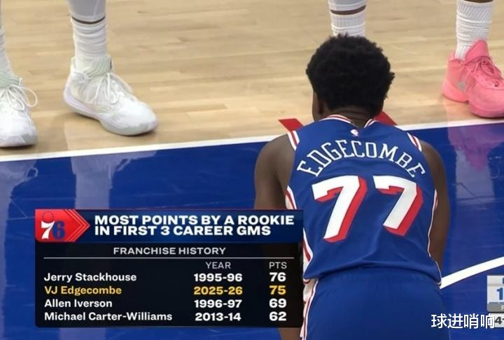 With this performance, Edgecombe successfully broke Iverson's record, scoring 75 points in the first three games, surpassing Iverson to become second in the history of the 76ers, second only to Stackhouse's 76 points.