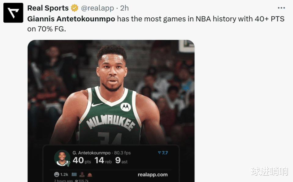 After once again scoring 40+ points with at least 70% shooting rate in this game, Antetokounmpo also led the NBA history in this data performance record.