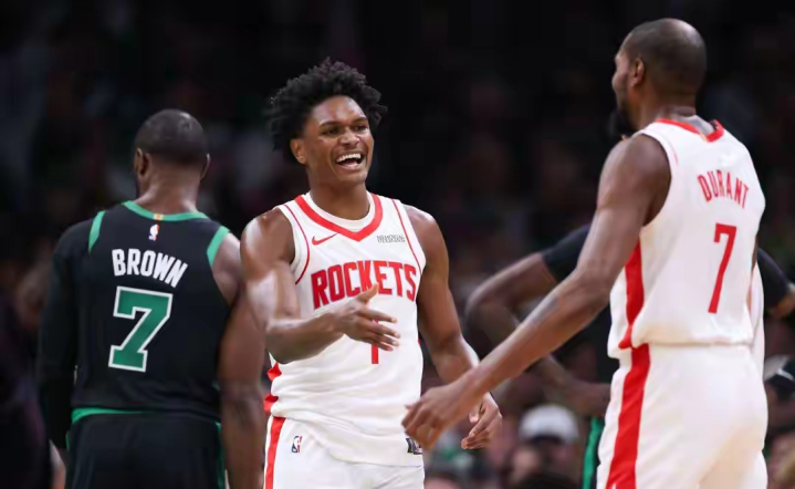 Looking back at the performance of the two teams in the last game, it was really a world of ice and fire. The Rockets faced the Celtics in the last game. They thought the Celtics were a tough team, but the Rockets beat them 128-101, winning by a full 27 points. The biggest point difference was more than 30 points. In this game, the Rockets' three-pointers were as if they were hanging up, no matter how hard they shot, the Celtics were completely stunned. The core Durant played so easily, playing 29 minutes, 8 of 11 shots, 2 of 3 three-pointers, 8 of 9 free throws, 26 points and 4 rebounds, 2 steals and 2 blocks. He clocked out in the third quarter. The team won by 21 points when he was on the court. When the Celtics wanted to chase points, he could always use shooting to stabilize the situation. Shen Jing also almost got a triple-double, with 16 points, 10 rebounds and 9 assists. He played hard and clever inside. Amen Thompson also had a near-triple double with 17 points, 9 rebounds and 8 assists. No wonder the team could win so easily.