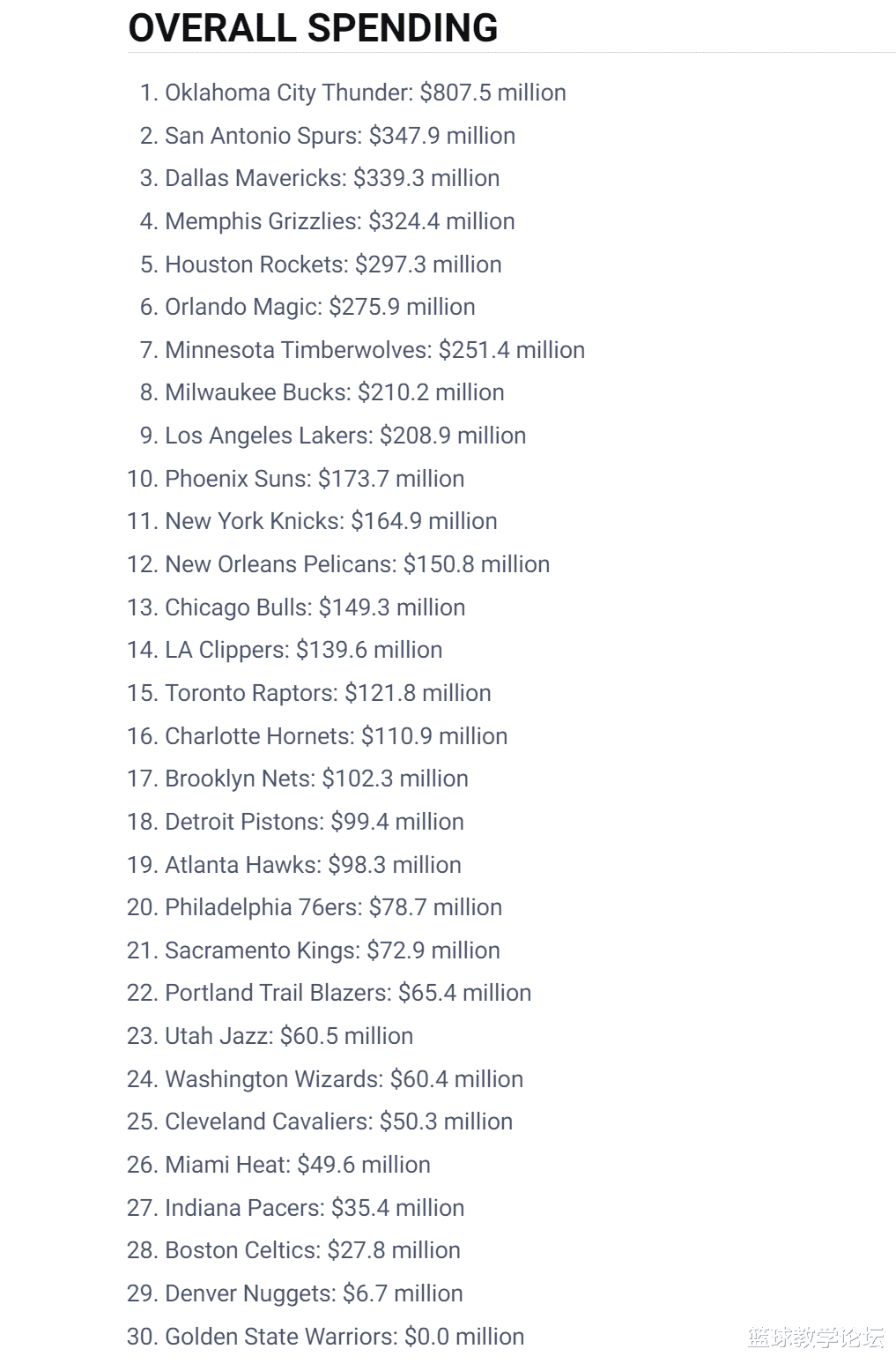 In addition to choosing Sauber, the Thunder did not have much reinforcement during this offseason. They mainly retained the championship lineup and renewed the contract with three core contracts: renewing Alexander in four years, US$285 million in advance; renewing Jaylen Williams in five years, US$287 million in five years, and renewing Homgren in five years, US$239 million. The Thunder invested a total of US$807.5 million, ranking first in the league!