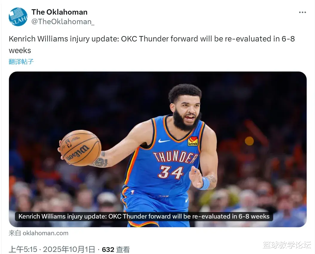 On October 1, Thunder officially announced that Kenridge Williams underwent left knee arthroscopy and had a follow-up examination 6-8 weeks later. Before the regular season began, two players of the Thunder have seriously injured their knees: Thomas Sauber, the No. 15 pick, suffered a torn cruciate ligament of his right knee during training and was reimbursed in advance in the 2025-26 season.