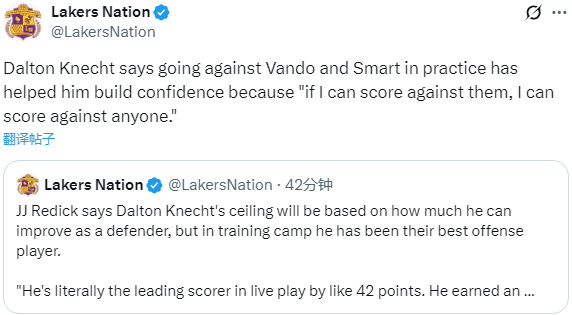 Redick confirmed the matter after the game. He said that during the training camp, Knect played the best offensive performance among all Lakers players. The team has data tracking. In actual combat, he scored 42 points higher than any other teammate, and his shooting percentage was around 60%. But Redick also said Knect's ceiling will depend on his defense.