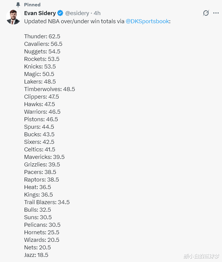 On October 8, the US media DKSportsbook predicted the record of the league's 30 teams: