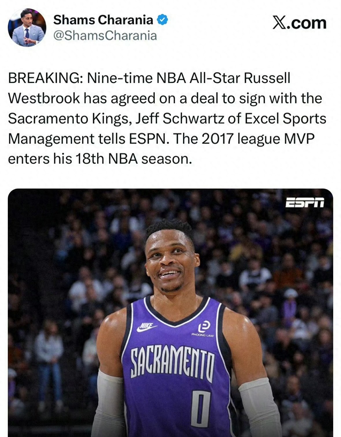 According to NBA "revealer" Shams Charania, Westbrook has reached an agreement with the Kings and will start his 18th season in Sacramento. This will also be the 8th team he has played for in his career (including the Utah Jazz).