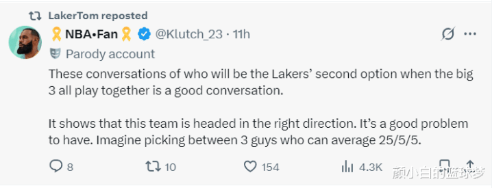The Lakers reporter responded: When the Big Three are on the court at the same time, the discussion of who will be the Lakers' second choice is very interesting. This shows that this team is moving in the right direction. Imagine what a sweet burden it is to have three players who average 25+5+5 per game?