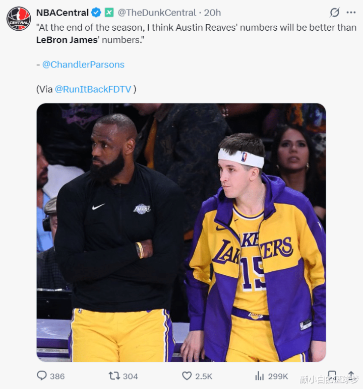 Austin Reeves performed a super performance in the opening stage, averaging 38.2 minutes per game, 34.2 points, 10 assists, 5.6 rebounds and 1.8 steals. Parsons later said on the podcast: I think Reeves' data will be better than James at the end of the season. Then someone commented that the 40-year-old LeBron's comeback would drag down the Lakers because one ball is not enough and the Lakers don't need three ball handlers.