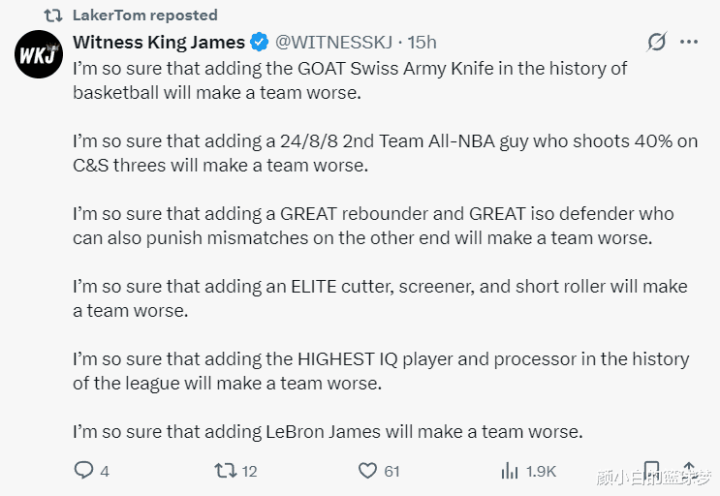 I am very convinced that after adding a player who averaged 24+8+8 per game and was selected for the best second team, and his three-point shooting percentage and mid-range shooting percentage reached 40%, this team will become worse;