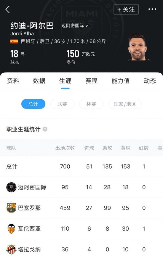 The 36-year-old Spanish left-back Alba has played for Valencia, Barcelona, Inter Miami and other teams in his career. In July 2012, Alba joined Barcelona from Valencia for 14 million euros. In his career, he played 459 games for Barcelona and contributed 27 goals and 99 assists. In July 2023, Alba left Barcelona, where he had played for 11 years, and joined Inter Miami. Since then, he has become teammates with Messi, Busquets, and Suarez again.