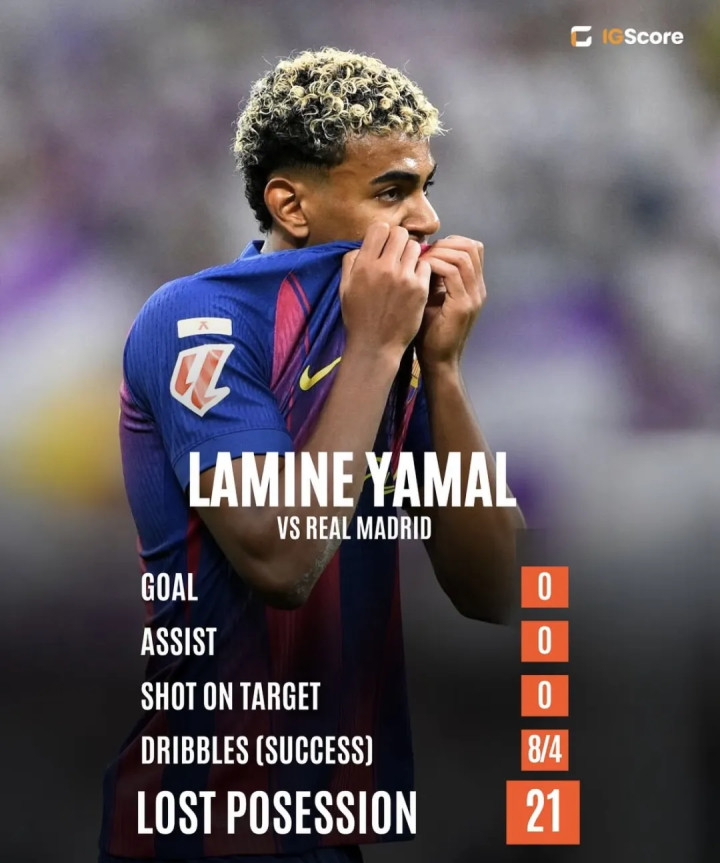 In this national derby, Yamal's performance can be said to be completely inferior to Mbappe. He only had 2 shots in the game, 0 shots on target, and lost the ball 21 times, the highest number in the game.