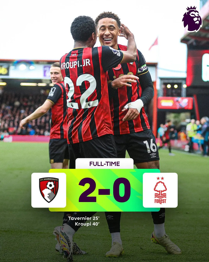 In the 9th round of the Premier League, Bournemouth faced Nottingham Forest at home. In the first half, Tavernier scored directly from a corner kick, and Crupi scored from a long shot. In the end, Bournemouth defeated the opponent with 2 goals at home.