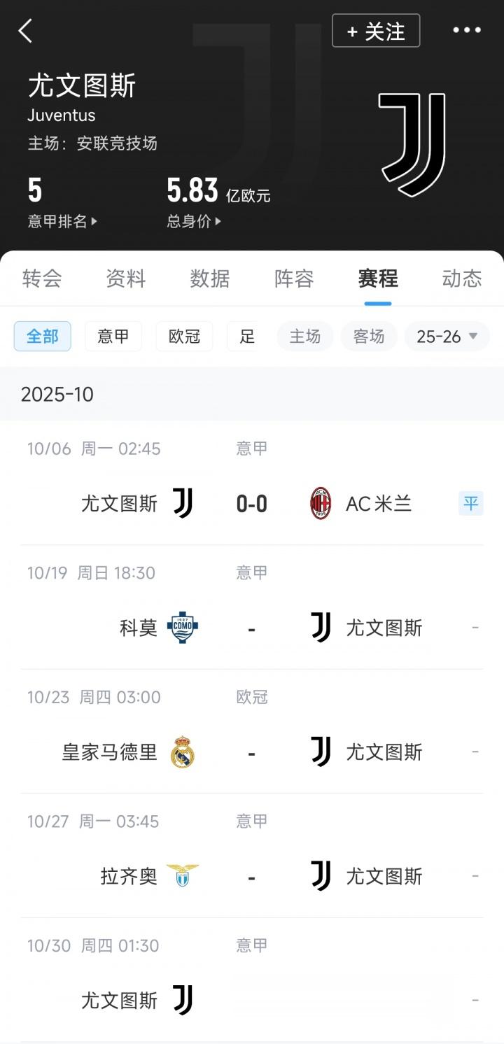October 7th, in the 6th round of Serie A, Juventus drew 0-0 with AC Milan, and drew five consecutive games in all competitions, and has been unbeaten this season. After the international match day, Juventus will usher in a relatively difficult three consecutive away games in mid-to-late October, all against giants: Como, Real Madrid and Lazio. Udinese at the end of October is also not a good person.