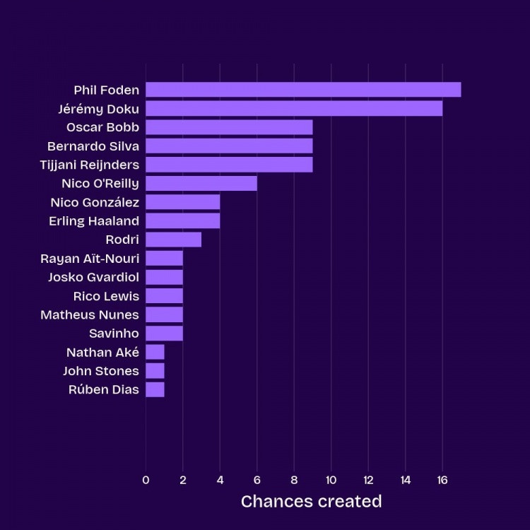 Manchester City s chances created this season: Foden 17 times, Doku 16 times, and three other players, including B, 9 times each.