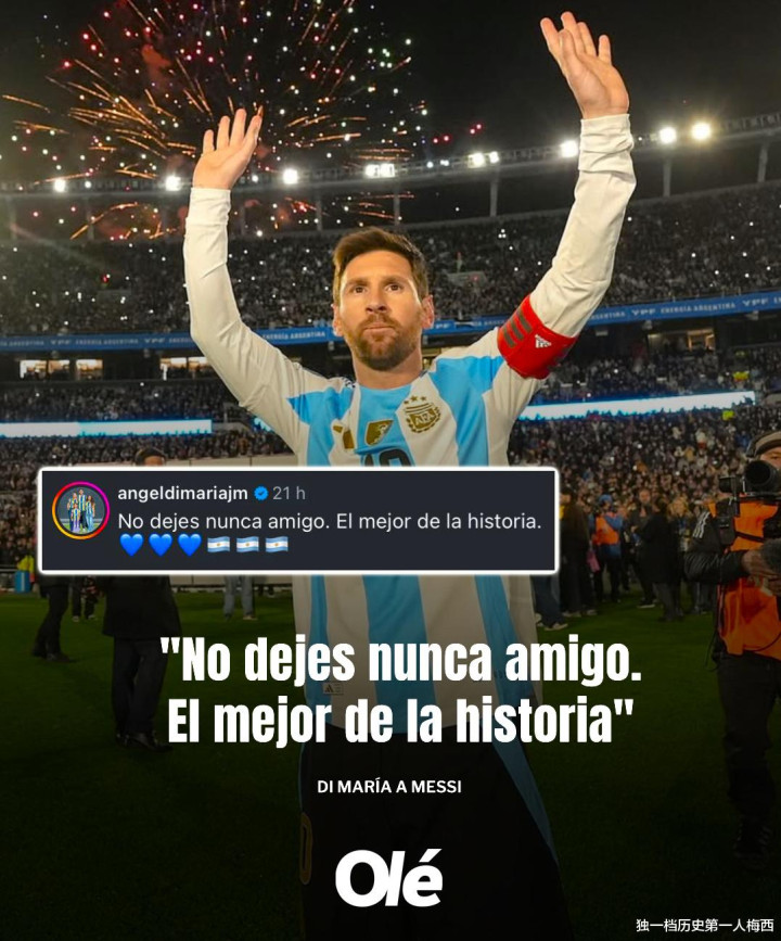 For the whole world, everyone is eager for Messi to play at least next year's World Cup. The Argentine media "Ole" wrote an article to try to keep Messi, saying that the world is not ready for Messi to retire. Messi's good friend Di Maria, who has retired from the national team, appeared in the comment section of Messi's update and left a message: Never stop! My friend! The first person in history!