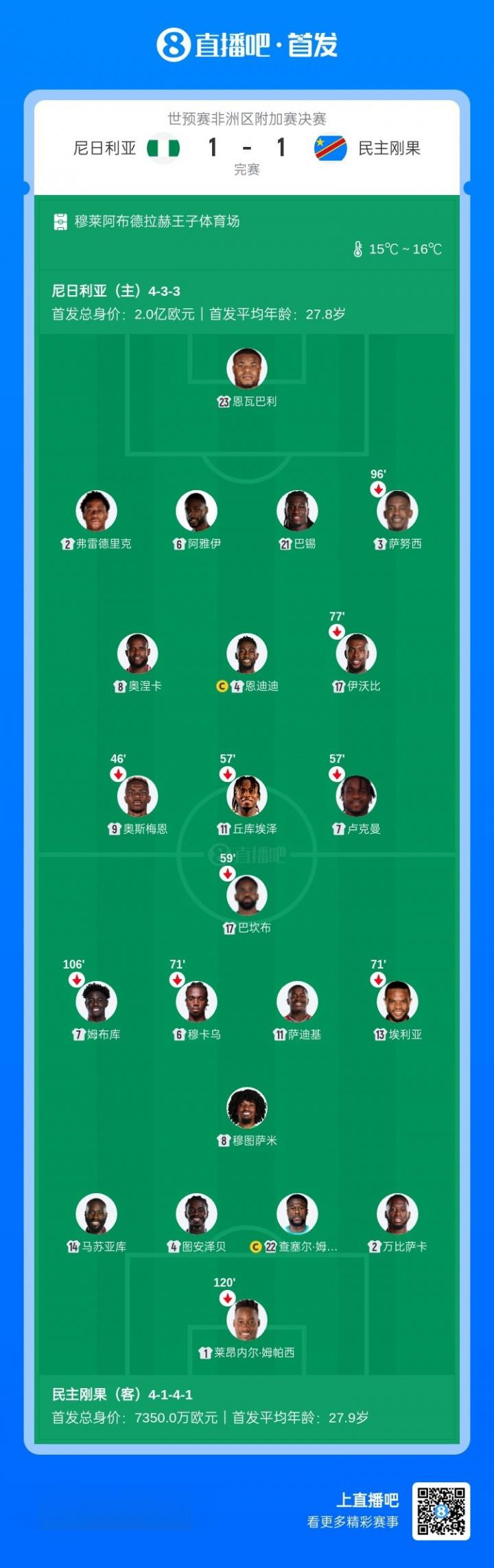 On November 17, Nigeria lost to the Democratic Republic of the Congo in a penalty shootout in the African play-off final of the World Cup preliminaries and missed the World Cup for the second consecutive time. During the game, the Nigerian coach's substitutions caused heated discussion.