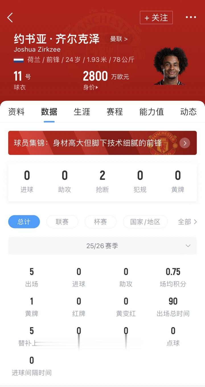 The 24-year-old Dutch center Zirkzee has not been selected for the national team for a year. Last summer, he moved to Manchester United from Bologna for 42.5 million euros, and his value has continued to decline. He was directly abandoned this season, making 5 appearances and 0 starts, with a total of only 90 minutes played.