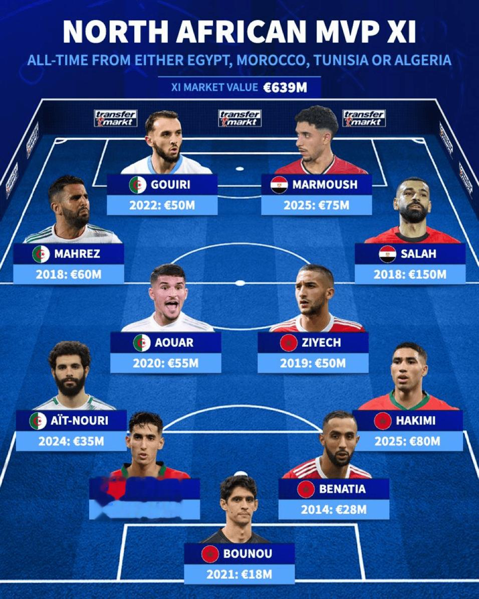 Hupu News on October 15th: The German transfer market took stock of the most valuable North African players in football history and formed a best lineup. The details are as follows: