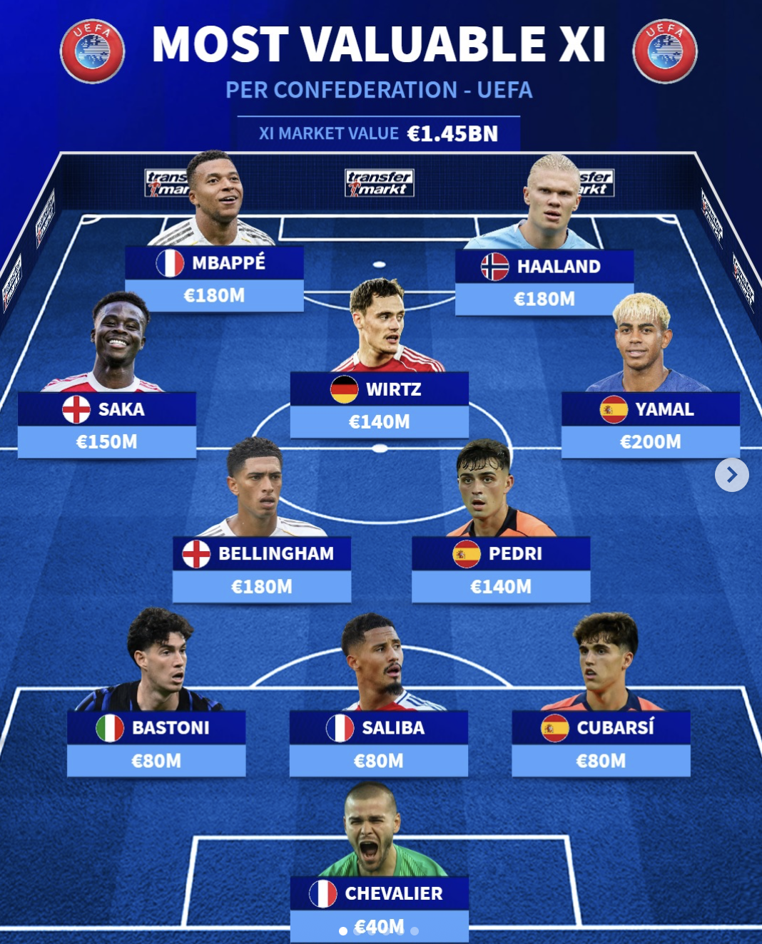 UEFA s most valuable lineup: Yamal led by 200 million; France and Spain each have 3 players selected