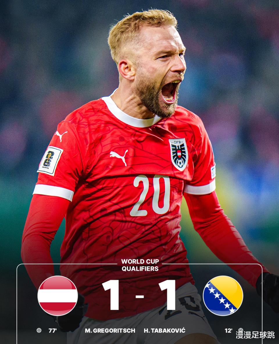 The situation in this group is very clear: Austria leads by 2 points, and will qualify as the first as long as they tie; Bosnia and Herzegovina must win. In the 12th minute of the opening, Bosnia and Herzegovina scored the first goal. Harris shot into the net from the penalty area, and Bosnia and Herzegovina led 1-0. In the second half, Austria accelerated significantly. In the 77th minute, Gregorich seized the opportunity in the melee and pushed the goal to tie the score to 1-1. The final score was fixed here. Austria secured first place in the group with 19 points and successfully qualified for the World Cup.