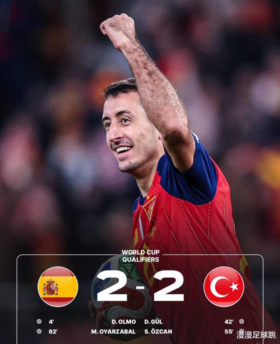 After changing sides and fighting again, the Spanish defense suddenly short-circuited. In the 54th minute, Ozcan's world wave penetrated the goal, leading the opponent 2-1 again. In the 60th minute, Oyarzabal scored a goal in the chaos, bringing the score back to 2-2. In the end, the two sides shook hands and made peace. Spain successfully secured the top spot in the group with 16 points and easily advanced to the World Cup.